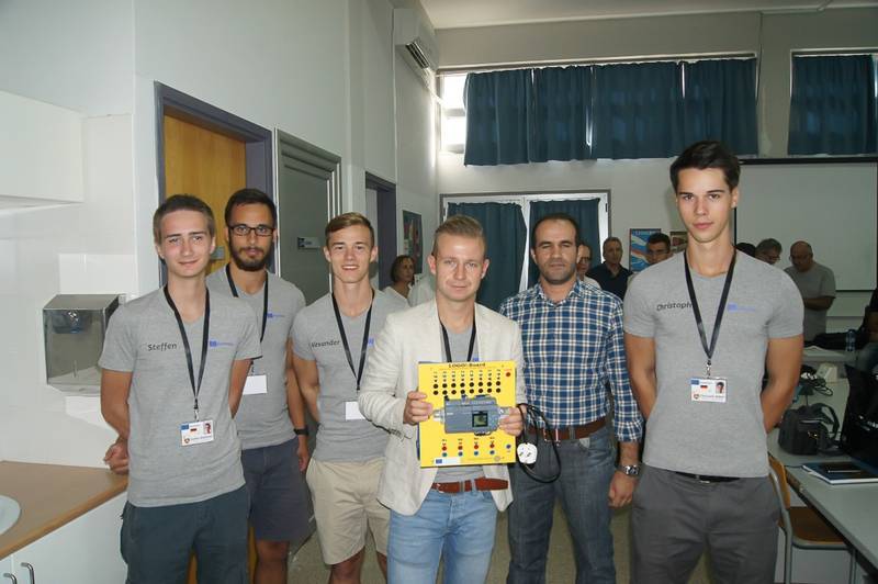 Das Technik-Team setzte sich aus zwei Auszubildenden Mechatronikern, zwei Elektronikern für Betriebstechnik und ihrem Lehrer, Studienrat Florian Brückner, zusammen. Schwerpunkt war die Konzeption und der unterrichtliche Einsatz von innovativen Lehr- und Lernmitteln im Elektrotechnikunterricht. Die Berufsschule Kronach leistete somit einen elementaren Beitrag zur curricularen Unterrichtsentwicklung in Zypern. Aus einzelnen Bauteilen fertigte man unterschiedliche Boards, die zielführend im zypriotischen Praxisunterricht, der Partnerschule „C´ Technical School“, eingesetzt werden können. Bei der Fertigung wurden verschiedene Arbeitstechniken vorgestellt. Hierzu zählten zum Beispiel die Dimensionierung von Schaltern und Leuchten, das Zuschneiden von Leitungen und Lötarbeiten. In der Projektsprache Englisch konnten die Zyprioten zielführend von den deutschen Schülern angeleitet werden. Am letzten Projekttag fand die messtechnische Erprobung der erstellten Lehr- und Lernmittel statt. Vorgestellt wurde dieses Erasmus+ Projekt auch dem zypriotischen Bildungsministerium und an der Technischen Schule in Larnaca. Diese beiden Seiten würdigten es sehr.