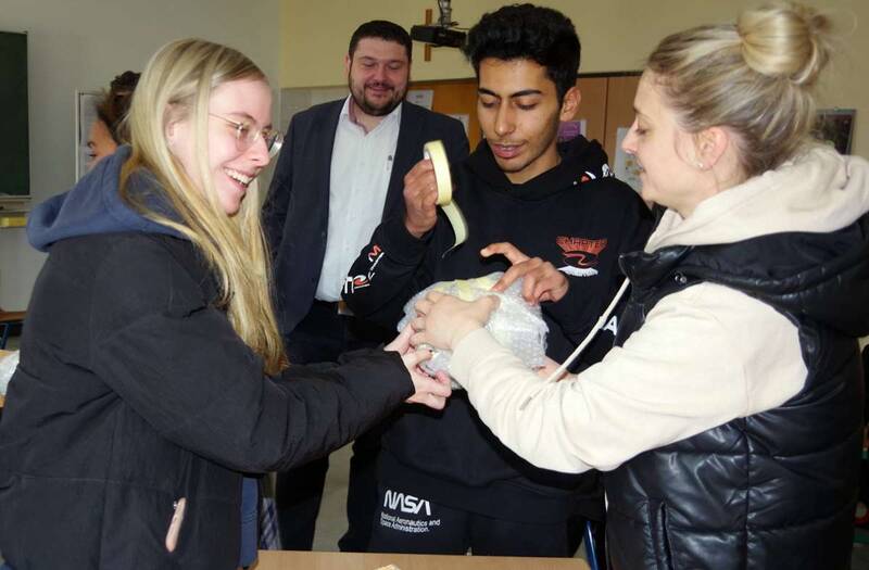 Fest verpackt, fliegen an diesem Donnerstagmittag drei Eier aus dem Klassenzimmerfenster der Lorenz-Kaim-Schule im dritten Stock. Schülerinnen und Schüler des beruflichen Schulzentrums hatten jeweils ein rohes Ei mit Schutzmaterial wie Schaumstoff, Luftpolsterfolie, Krepppapier, Karton oder Wolle umgeben, damit dieses hoffentlich den freien Fall auf den Boden unbeschädigt übersteht. Aus luftiger Höhe schickten einige nun die Eierflugmaschinen auf die Reise, während der Rest des Teams von unten das Geschehen beobachtete. Überstanden hat den Testflug am Ende nur ein Ei, die beiden anderen erlitten leider eine Bruchlandung. Das außergewöhnliche Experiment war Teil eines Projekts in Kooperation mit der Eugen-Biser-Stiftung mit Hauptsitz in München, benannt nach dem katholischen Theologen Eugen Biser.